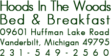 A rustic and comfortable Bed and Breakfast nestled in the middle of 40 acres of pine and cedar trees. We are located on the shores of beautiful Huffman Lake about halfway between Gaylord and Boyne Mountain in Northern Michigan. Relax in this nature lovers paradise where hospitality is our main concern. Take a few extra minutes and find an exciting experience off the beaten track at Hoods In The Woods.